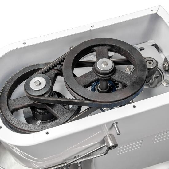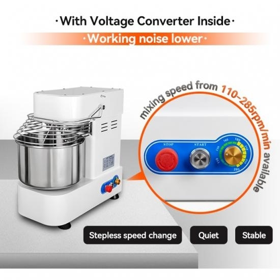 This commercial spiral mixer features belt transmission, built-in voltage converter, stepless speed control, and single-phase power operation for dough processing.