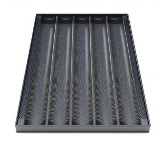 This aluminum baguette baking tray with Teflon coating comes in multiple row options, including 4, 5, 8, and 10 rows for versatile baking needs.