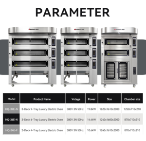 HQE-39F-NMÂ is a commercial 3-deck 9-tray electric oven.It is widely used in home kitchens, bakeries, cake shops, and food processing factories. Compared with gas ovens, electric ovens offer simpler operation and more precise temperature control, making them ideal for baking foods that require high temperature accuracy.